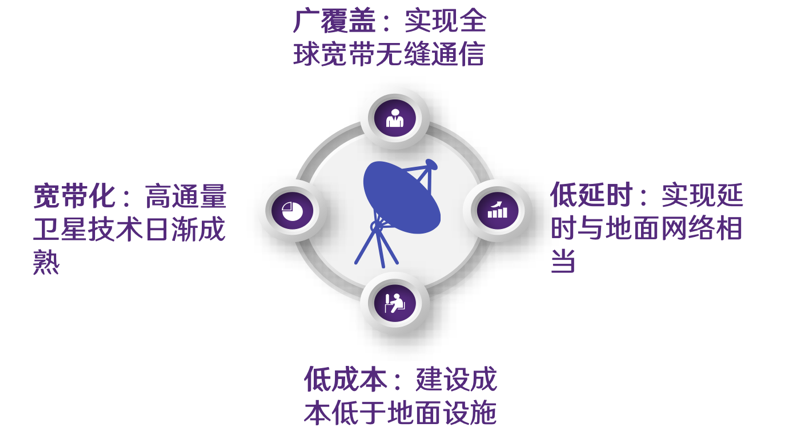 卫星互联网系统主要根据卫星所处的轨道高度进行分类,包括低地球轨道(LEO)、中地球轨道(MEO)、地球静止轨道(GEO)、太阳同步轨道(SSO)以及倾斜地球同步轨道(IGSO)。不同轨道的卫星通信系统在覆盖范围、系统容量、传输延迟、卫星寿命等方面具有各自的特点。特别是低轨卫星(LEO)因其较小的传输延迟、低链路损耗、发射灵活性、丰富的应用场景以及较低的整体制造成本,被认为是卫星互联网业务发展的理想选择。