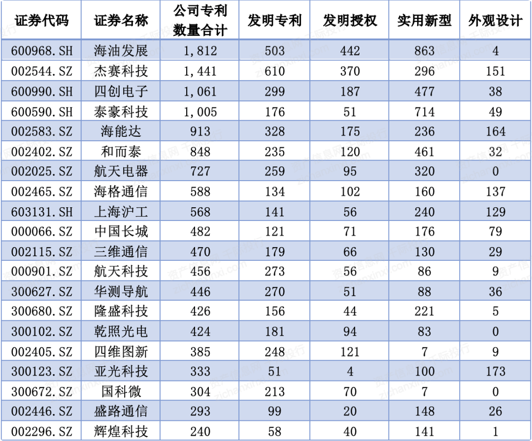 专利授权数量前3名的公司分别是海油发展、杰赛科技、四创电子,所对应的专利授权数量分别为1812件、1441件、1061件。