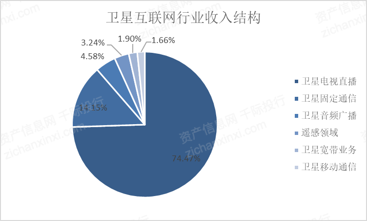 卫星电视直播业务收入占比最高,高达74.47“%。其次是卫星固定通信,业务收入占比14.15%。