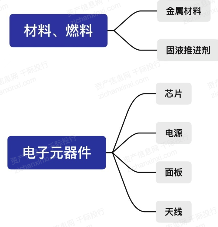 卫星互联网的产业链上游主要为电器元件及材料、燃料厂商。